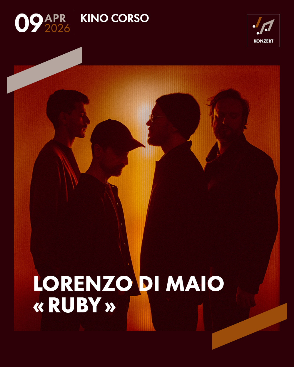 Kino Corso20:00 UhrJazzMit “Ruby” präsentiert der belgische Gitarrist Lorenzo Di Maio sein bislang persönlichstes Projekt: ein kraftvolles, zugleich lyrisches Quartett an der Schnittstelle von Jazz und Rock. In diesem Quartett ohne Bassisten steht der Synthesizer im Vordergrund und übernimmt die Basslinie und eröffnet ein breites elektrisierendes Klangspektrum. -