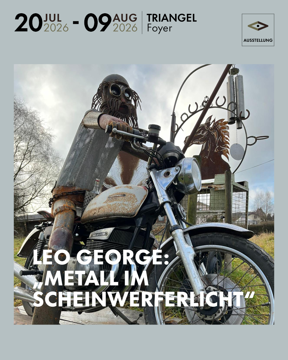 Triangel Foyer19:30 UhrMetall- und HolzkunstKreativität und Nachhaltigkeit gehen beim Eifeler Metallkünstler Leo George Hand in Hand. Er zeigt Werke aus den letzten Jahrzehnten aus seinem hauseigenen Museum Brunafa in Braunlauf: Skulpturen, Bilder, Schnitzarbeiten, Metallschrottkunst. Die Ausstellung geht auch der Frage nach, warum die Eiche härter als Eisen sein könnte. -